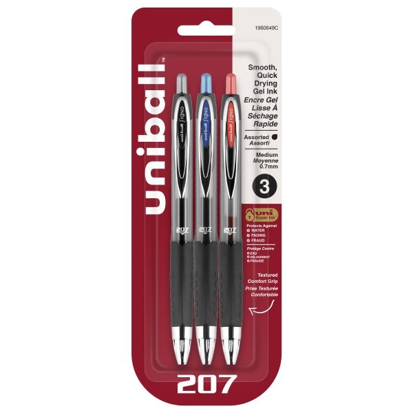 Uniball 207RT Retractable Gel Pen, 0.7mm, Assorted, 3/pkg