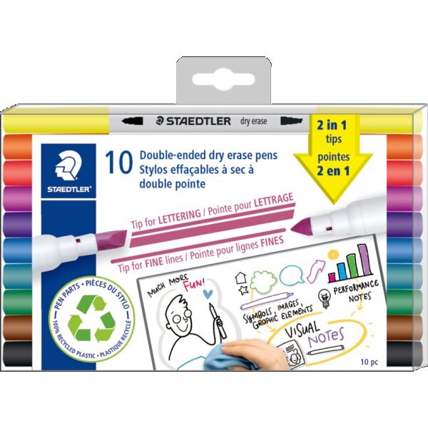 Pinit Staedtler® Double-Ended Dry Erase Markers, Assorted Colours, 10/pkg SKU STD95696 $11.89 Quantity discounts available QuantityPrice (0) No Reviews yet Memo Quantity -+ Add to Cart Details Odourless dry erase ink designed for classrooms, offices and homes. Vivid colours for increased visibility and colour coding. Contains a minimum of 70... DetailsBackDetailsOdourless dry erase ink designed for classrooms, offices and homes. Vivid colours for increased visibility and colour coding. Contains a minimum of 70% post-consumer recycled material. Chisel tip and bullet tip. Assorted colours. 10 per package. Ratings and ReviewsNo reviews availableBe the first to Write a Review
