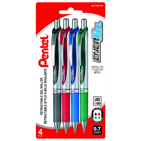 Pentel EnerGel Retractable Gel Pen, 0.7mm, Assorted Colours, 4/pkg